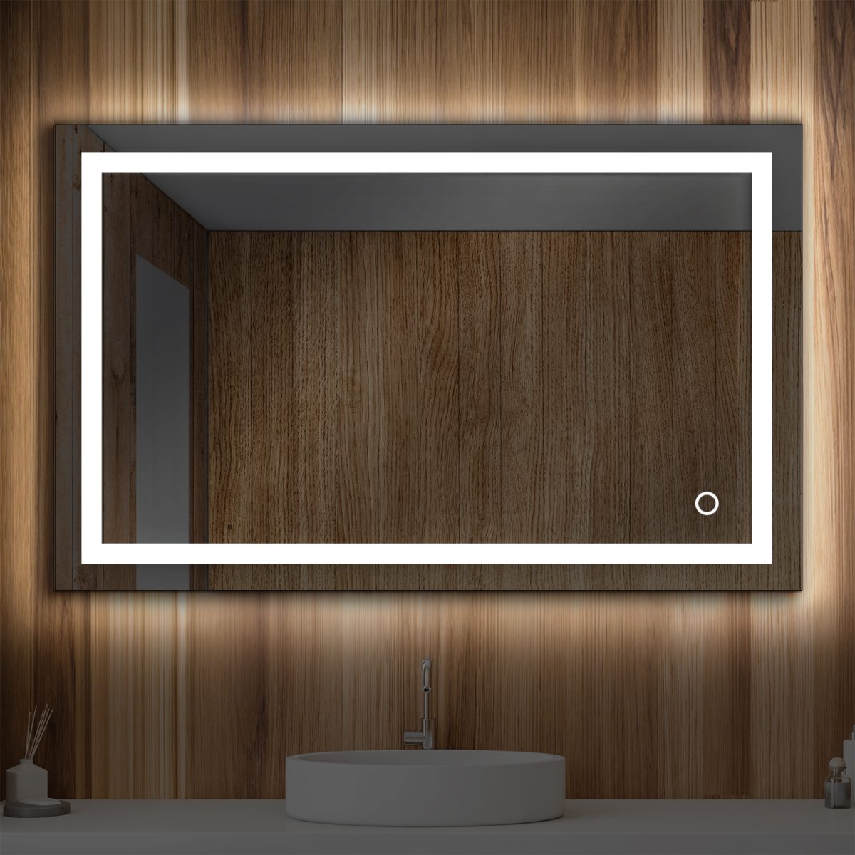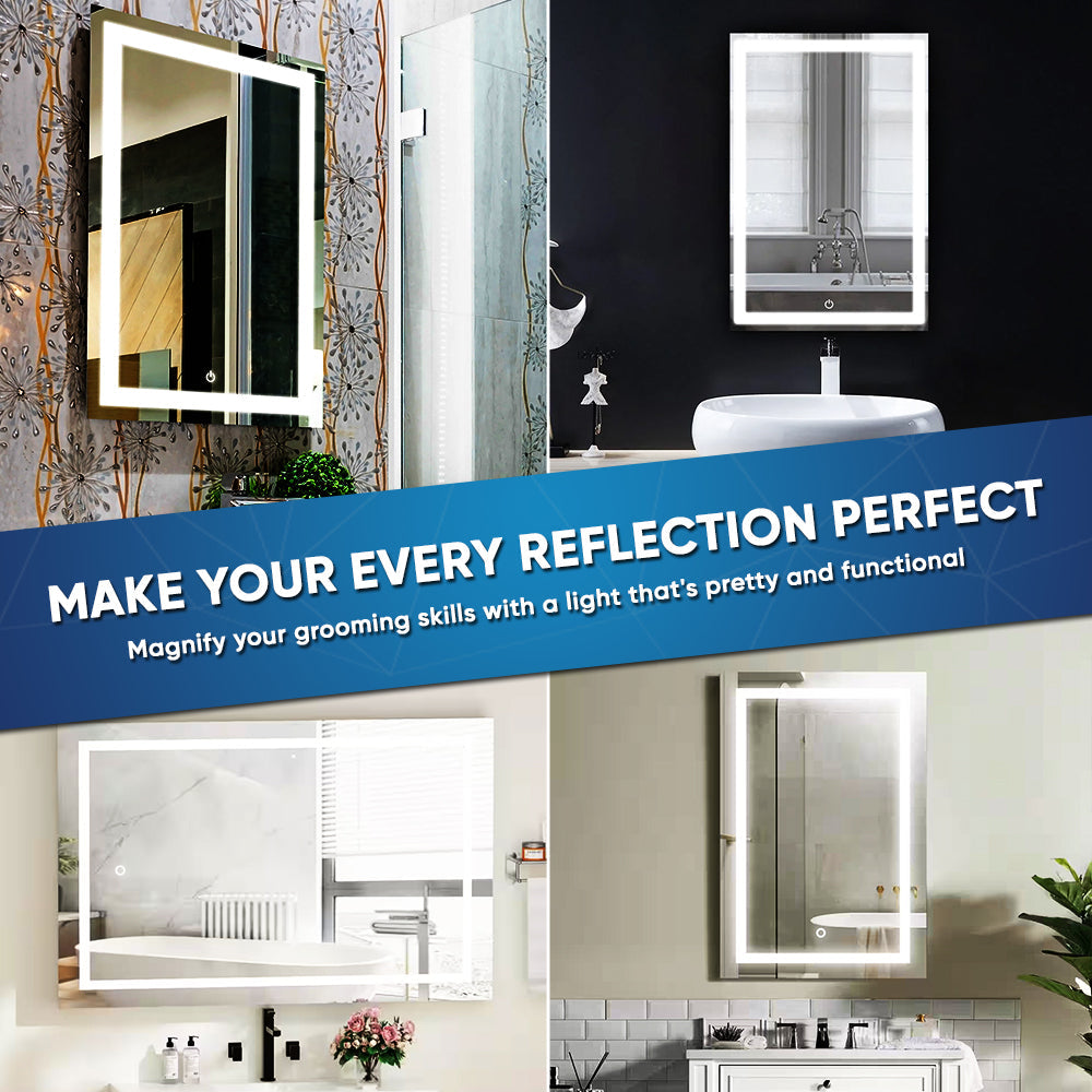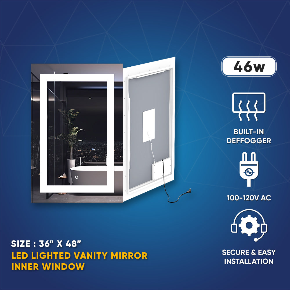 Enhance the attractiveness of your bathroom with a 36" x 48" LED Lighted Bathroom Mirror of premium quality. This decorative item provides 2400-2800 lumens by means of a touch switch that allows for adjusting the CCT to 3000/4000/4200/6000K. These mirrors are ideal for lighting up any indoor space such as bathrooms and bedrooms, with a streak-free finish and smart design. They come with a built-in defogger that provides a clear reflection after showering. These mirrors are built to last, with a durability of 50,000 hours and a 5-year warranty.